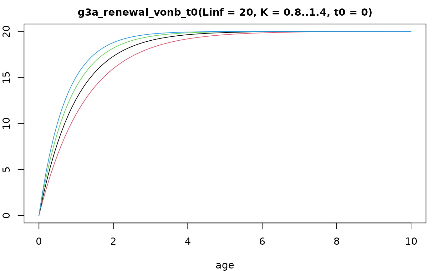 0, 10, col = 2, xlab = "age", main = "g3a_renewal_vonb_t0(Linf = 20, K = 0.8..1.4, t0 = 0)")